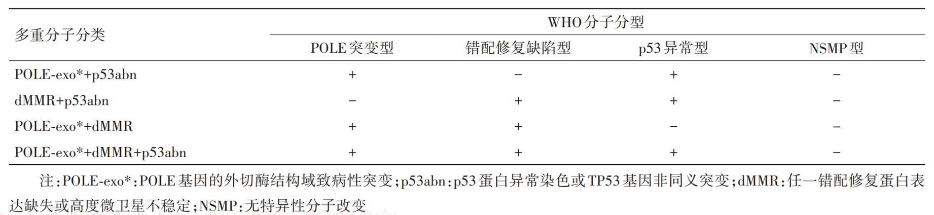在TCGA分子分型方案中,POLE基因突變 、MSI/MLH1沉默以及TP53基因突變?cè)?POLE超突變型和MSIH型中常存在交叉重疊。雖然大多數(shù)子宮內(nèi)膜癌可以通過(guò)使用替代分子分型方案被明確地劃分為單一的分子亞型,但仍存在3.0%~11.4%的子宮內(nèi)膜癌展現(xiàn)出一種以上的分子分型特征,被稱為“多重分子特征”子宮內(nèi)膜癌[2]。