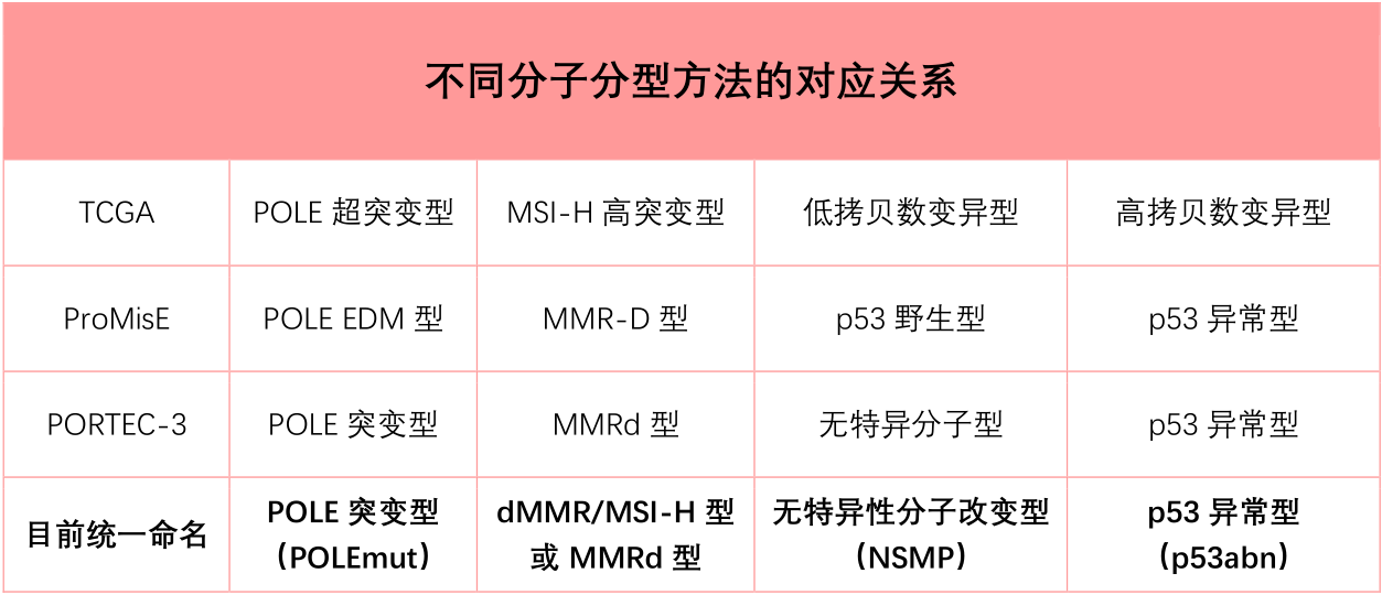 TCGA子宮內(nèi)膜癌分子分型整合了基因組學(xué)、轉(zhuǎn)錄組學(xué)、蛋白組學(xué)、基因拷貝數(shù)和甲基化數(shù)據(jù),將EC分為POLE超突變型(POLE ultramutated,POLEmut)、微衛(wèi)星高度不穩(wěn)定型(microsatellite instability-high,MSI-H)、低拷貝數(shù)型(copy number low,CNL)、高拷貝數(shù)型(copy number high,CNH)4種亞型。此后很多學(xué)者對(duì)EC分子分型進(jìn)行了方法學(xué)簡(jiǎn)化及流程優(yōu)化,提出了TransPORTEC和ProMisE分子分型策略,分子分型也逐步占據(jù)越來(lái)越重要的地位。現(xiàn)如今分子分型已被國(guó)內(nèi)外指南共識(shí)所推薦,F(xiàn)IGO 2023新版分期也納入了分子特征[1]。