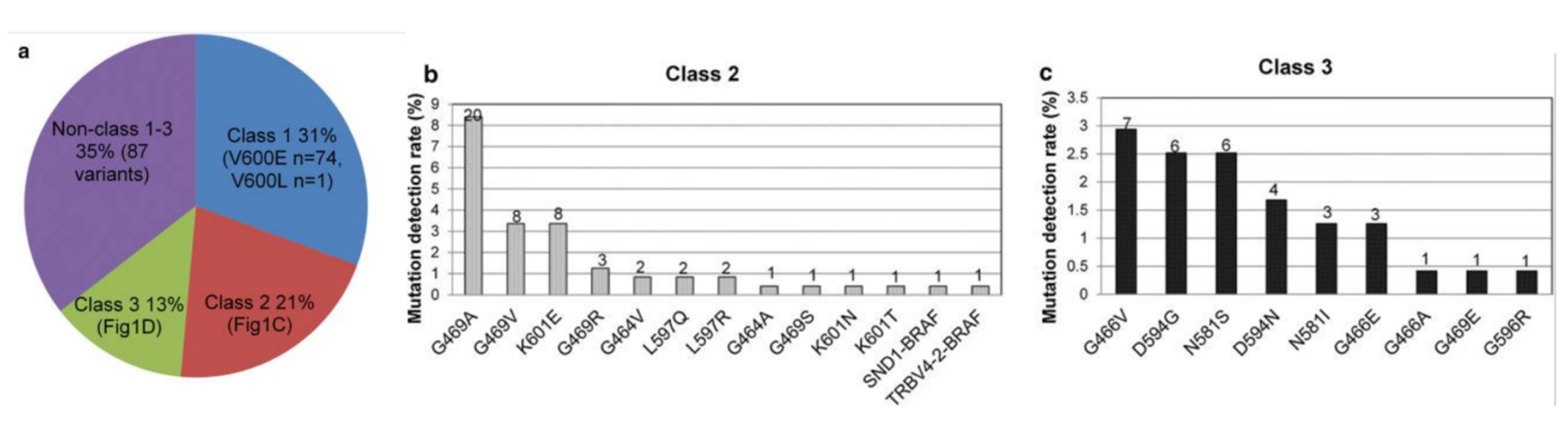 根據(jù)BRAF變異信號傳導機制和激酶活性,可將其分為三種功能類別:不依賴RAS,BRAF 激酶活性強,比如V600E/L等(1 類);不依賴 RAS,但靠二聚體形式激活通路,激酶活性比野生型高,比如G469A、K601E等(2類);以及依賴RAS ,激酶失活的異二聚體變異(3 類)[4]。